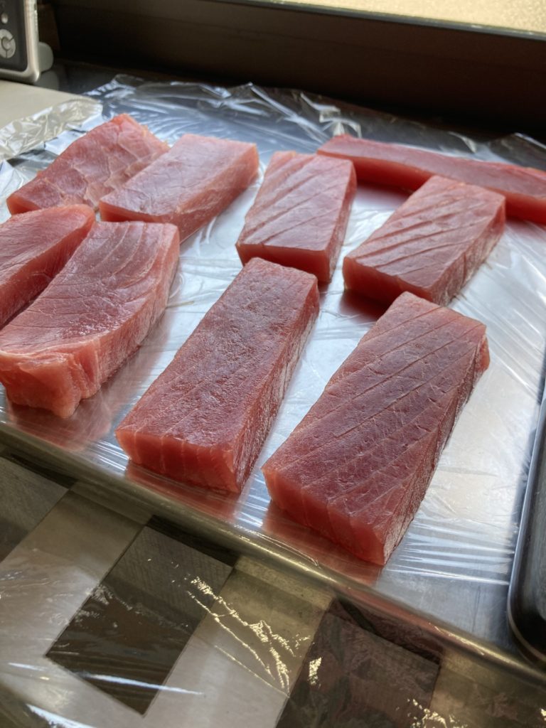 明日からの営業で丁度よく水気の抜け、うま味が凝縮したメバチマグロを是非、お召し上がり下さい。